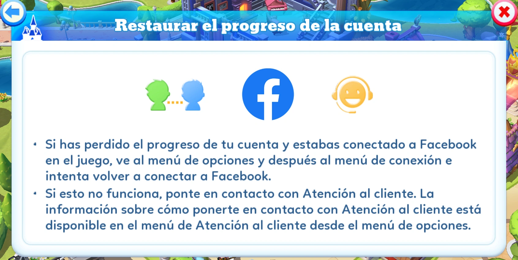 Si has perdido el progreso de tu cuenta y estabas conectado a Facebook o Game Center, reconéctate a la cuenta a la que estabas conectado para recuperar tu partida perdida. Ten presente que, debido a obligaciones legales, algunos jugadores no pueden acceder a redes o funciones sociales en el juego.