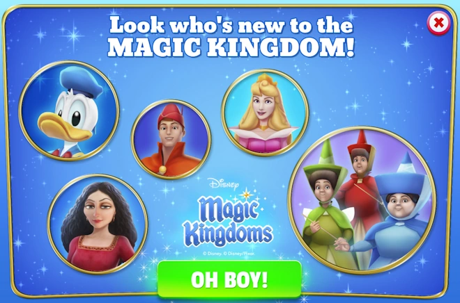 Sleeping Beauty Update[]On 4th May 2016, the second (2nd) update and the first (1st) major update (1.1.0) was released for the game. Your Disney Magic Kingdoms is about to get a lot more magical with new characters, attractions and more! Introducing Disney Princess Aurora, and other beloved characters from Disney's Sleeping Beauty. Update 1 is here with new characters, attractions, decorations, balance changes, as well as bug fixes. Speaking of which, the Daily Reward issue has been fixed. Daily Rewards will now continue from whenever you stopped receiving them – meaning you won't miss out on any of the goodies. For example, if you stopped receiving the rewards since Day 5, The Daily Rewards will resume from Day 5. Windows players, you will now be able to grant Wishes again, as we’ve fixed the issue with the Wishes not generating. Repopulate your park with happy Visitors once more! Some players are also reporting incorrect push notifications for completed quests. We are looking into it, but in the meantime, you can always manage your Notification Settings in the Options Menu. 47+ New Quests!